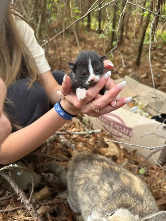 While walking her dog near a wooded area in Rome, Georgia, a woman made an incredible discovery. Her pupâs strange behavior led her to a cardboard box hidden among the trees, where five tiny kittens were huddled together. Moments later, two adult cats appearedâone was their mama, and the other heavily pregnant.