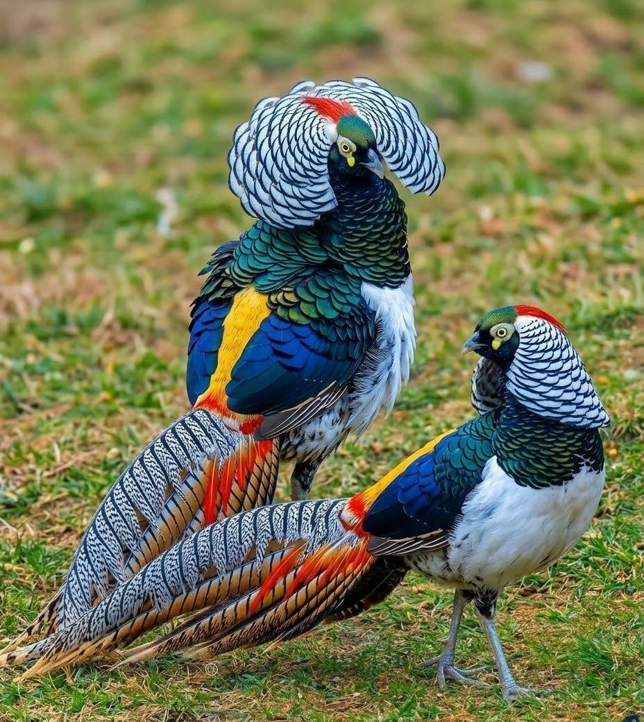 In the misty mountain forests of southwestern China and Myanmar, these regal ground wanderers move like living silk beneath the trees. The males dazzle with sweeping white capes striped in black, long patterned tails, and flashes of emerald, crimson, and sapphire that shimmer in the dim light. They forage through leaf litter for seeds, roots, berries, and small insects, scratching the forest floor with quiet patience. What makes them extraordinary is their dramatic courtship display — the male fans his ornate cape around himself like a living shield of patterns, creating one of the most mesmerizing spectacles in the bird world. A vision of elegance in the shadows, yet a silent steward of the mountain forest.