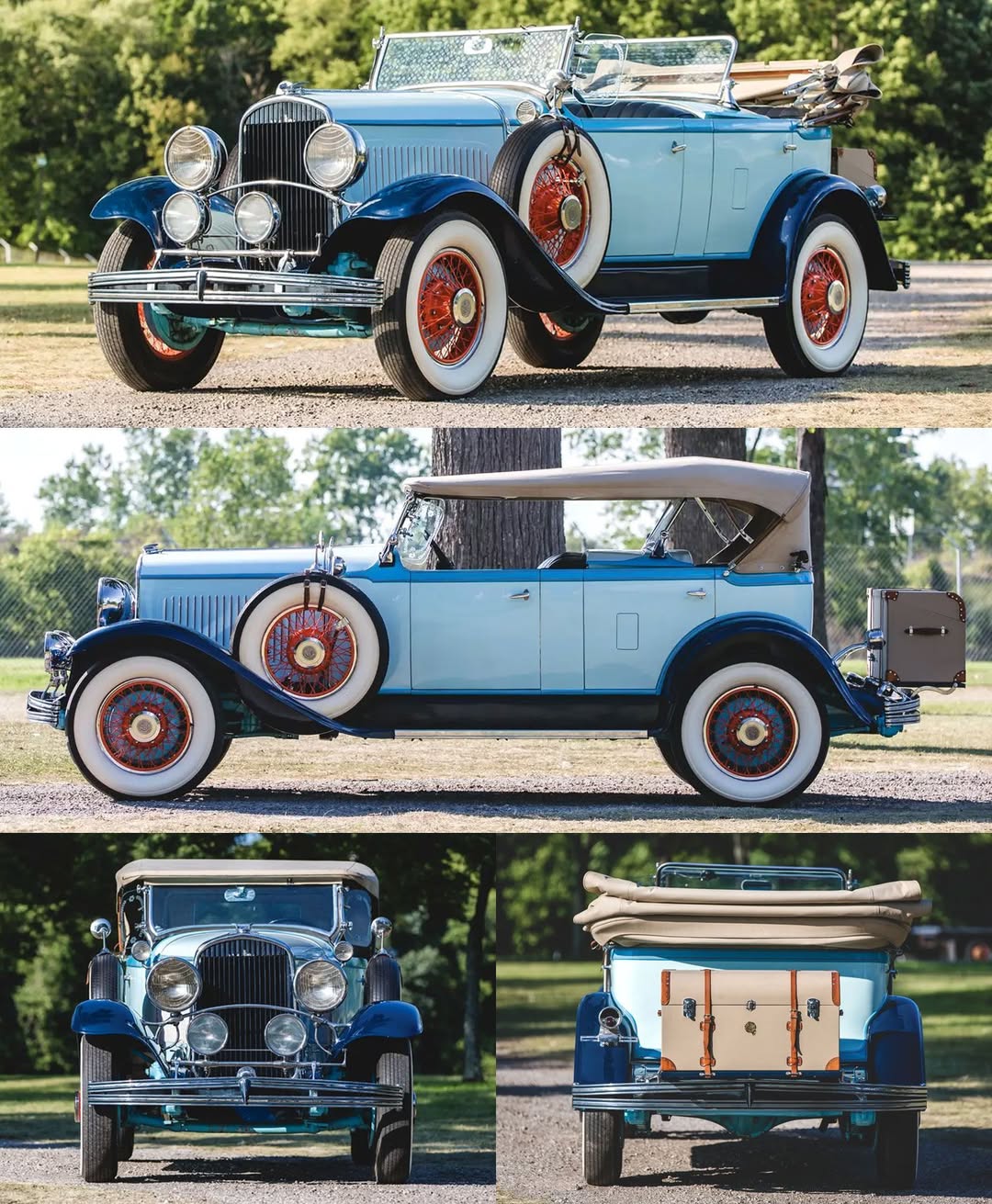 The rare Tonneau Phaeton body style showcased distinctive two-tone blue paint complemented by eye-catching orange wire wheels and pinstriping details that made this luxury touring car unmistakable on period roads.
