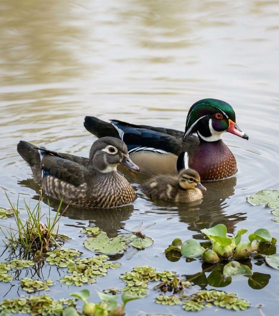 In the quiet swamps, wooded ponds, and slow rivers of North America, these elegant waterfowl drift like painted reflections on still water. The males shimmer with iridescent greens, purples, and crisp white patterns, while the females carry a softer beauty of warm browns and gentle eye rings. They feed on seeds, fruits, and aquatic plants, often dabbling near the surface or foraging along the water’s edge. What makes them extraordinary is their hidden nesting life — raising their young in tree cavities, where ducklings leap fearlessly from high branches to the water below. A masterpiece of color on calm waters, yet a quiet marvel of the woodland wetlands.