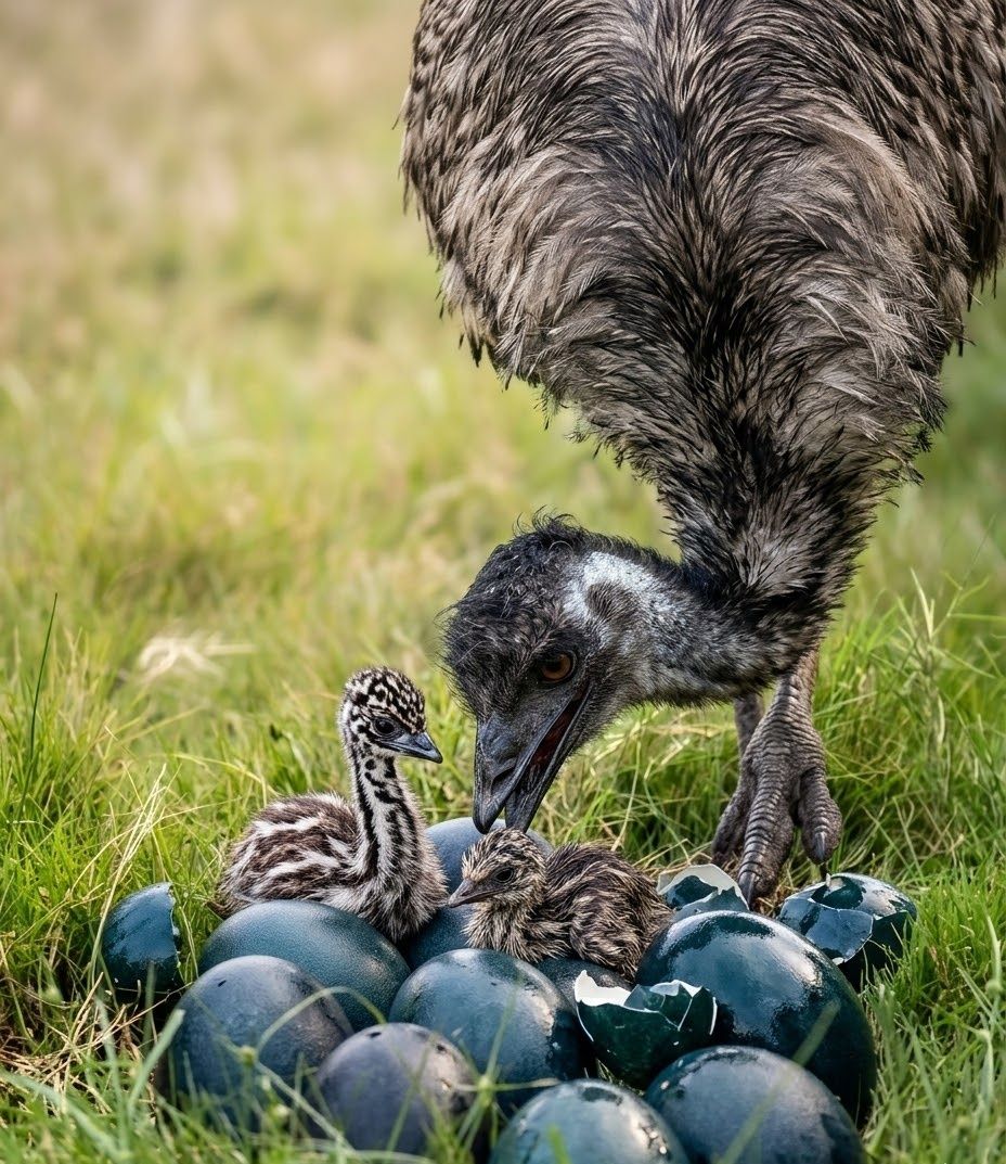 In the open plains and scrublands of Australia, this striped youngster moves close behind its father through sunlit grasses. Dressed in soft brown feathers lined with pale stripes, the young emu blends perfectly into the dry landscape as it learns to forage for seeds, shoots, and insects. What makes it extraordinary is its upbringing — the male raises the chicks alone, guarding and guiding them across vast distances. A small shadow following steady footsteps, yet a future giant of the outback.