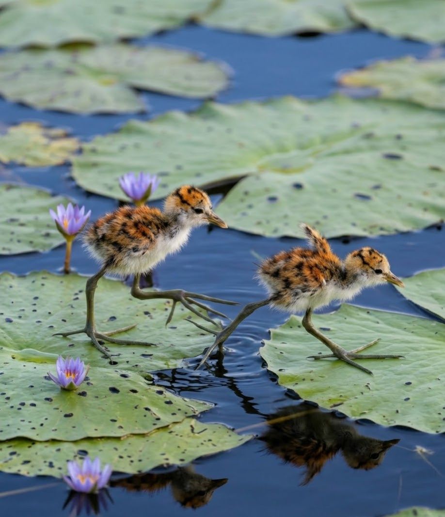 In the shallow wetlands of northern Australia and nearby regions, this long-toed wanderer steps lightly across floating vegetation as if walking on water. Its spidery toes spread wide over lily pads, allowing it to glide effortlessly while searching for insects, seeds, and small aquatic creatures. The striking comb atop its head gives it a bold, almost prehistoric look. What makes it extraordinary is its role as a watchful parent — males take on the task of incubating eggs and protecting the chicks among fragile wetland homes. A delicate step on mirrored waters, yet a resilient spirit of the marsh.