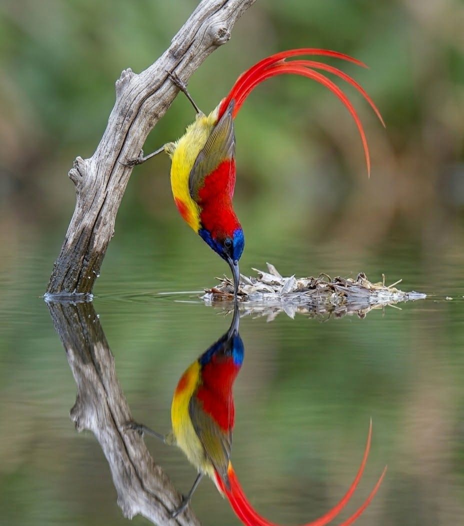 In the cool mountain forests of the Himalayas and Southeast Asia, this jewel-like nectar feeder flutters among blossoms with shimmering grace. The male glows with deep crimson, velvet black, and flashes of iridescent green, while the female carries softer olive tones, blending into the foliage. It feeds on nectar and tiny insects, slipping from flower to flower with delicate precision. What makes it extraordinary is its role as a highland pollinator — carrying life between blooms in forests where every flowering branch matters. A spark of living color in the mountain canopy, yet a gentle guardian of the blossoms.
