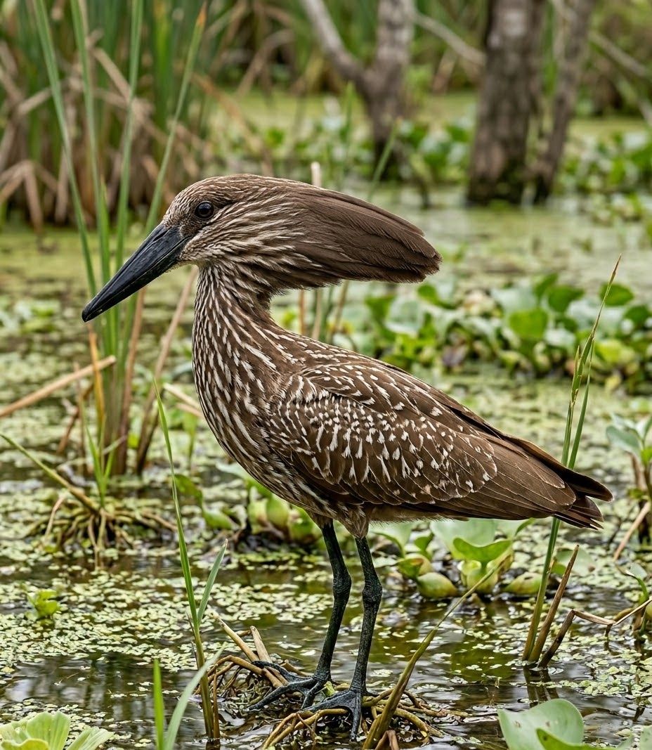 In the wetlands and riverbanks of Africa, this hammer-headed wanderer moves with steady purpose through shallow waters and muddy shores. Its silhouette is unmistakable — a long bill and backward crest forming a shape like a hammer against the sky. It feeds on fish, frogs, and small aquatic creatures, stalking patiently before striking with precision. What makes it extraordinary is its monumental nest — a massive domed structure of sticks and mud, large enough to stand inside, built high above the water. A curious shape in the marsh, yet a master builder of the wetlands.