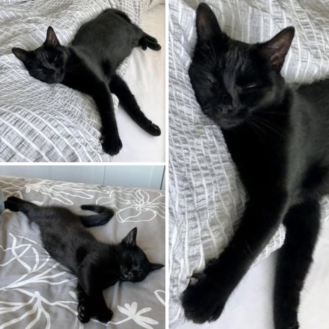 It’s a rescued black cat finally sleeping without fear.