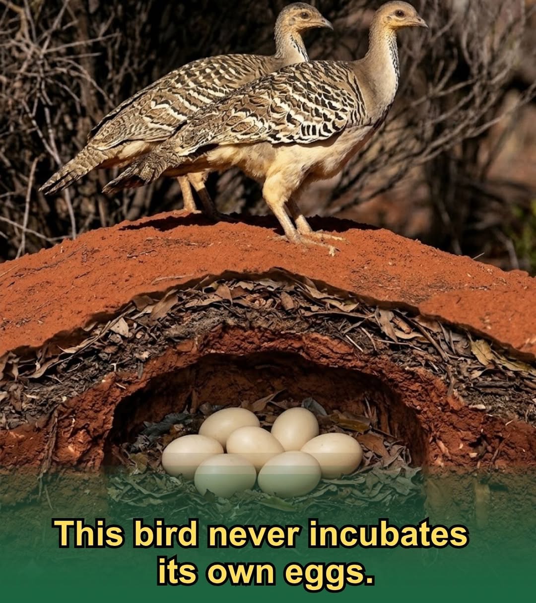 This bird doesn’t use its body heat to incubate eggs — instead, it builds a massive mound of soil and decaying leaves, letting nature do the work. In the dry scrublands of Australia, the Malleefowl becomes a master of temperature control.