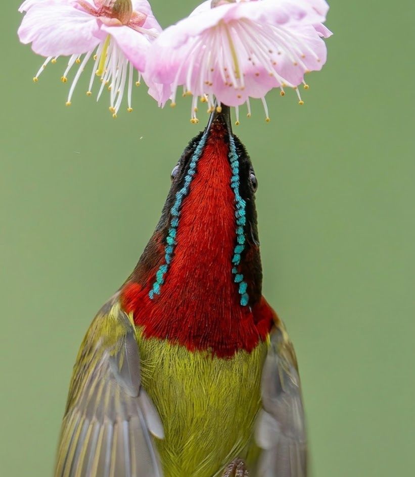 This bird flashes metallic colors while hovering at flowers, using its slender curved bill to sip nectar with delicate precision. In the tropical forests and gardens of Southeast Asia, the Fork-tailed Sunbird moves like a flicker of living light among blossoms.