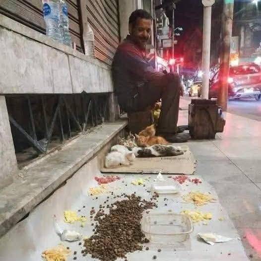 In front of him, on a piece of paper spread on the ground, he has carefully laid out food. He doesn’t have fancy bowls or tables, but he offers what he can: dry food, pieces of meat, cheese, fresh water, and milk. Everything is placed with care, as if he’s presenting them a feast. For him, feeding these stray animals is not just charity it’s an act of respect, a way of restoring their dignity.