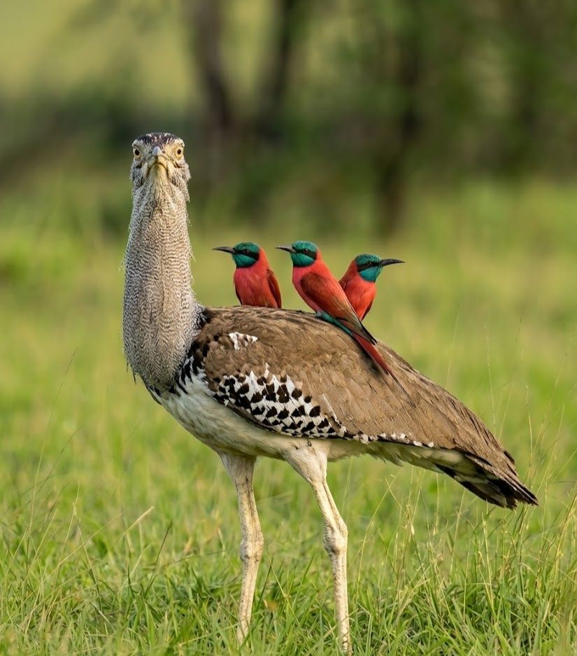 These birds don’t take an Uber — they live in symbiosis. Across the African savanna, the massive Kori Bustard walks steadily through the grass while flocks of Carmine Bee-eaters follow closely behind, turning every step into opportunity.