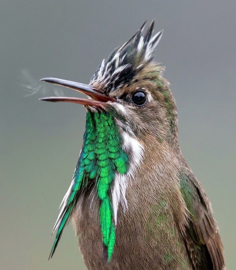 In the cool highland forests of Brazil, the Green-crowned Plovercrest hovers like a tiny emerald spirit among flowering shrubs. The male flashes an iridescent green crest — a radiant crown that can be raised or lowered depending on mood, appearing suddenly like a spark of light. It feeds on nectar and tiny insects, darting between blossoms with delicate precision. What makes it extraordinary is this living jewel of expression — a crown that flickers into view only when the moment calls for it. A flash of green in the mountain air, yet a quiet monarch of the flowers.