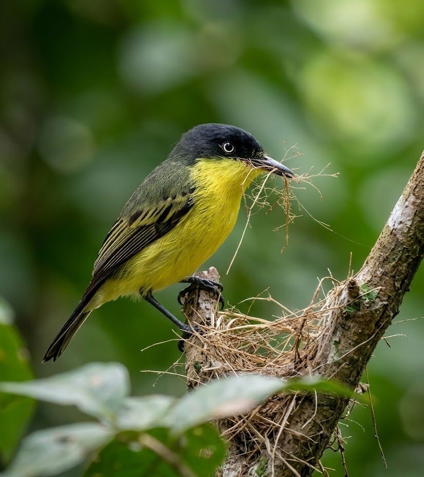 In the lush forests of Central and South America, the Common Tody-flycatcher flits through low branches with restless motion. Its bright yellow belly and fine bill flash between leaves as it darts out to snatch tiny insects from the air. Despite its size, it is bold and territorial, defending its space with surprising determination. What makes it extraordinary is its precision — hovering briefly, then striking with perfect timing in the dense understory. A flicker of yellow in the green shadows, yet a fierce hunter of the smallest prey.