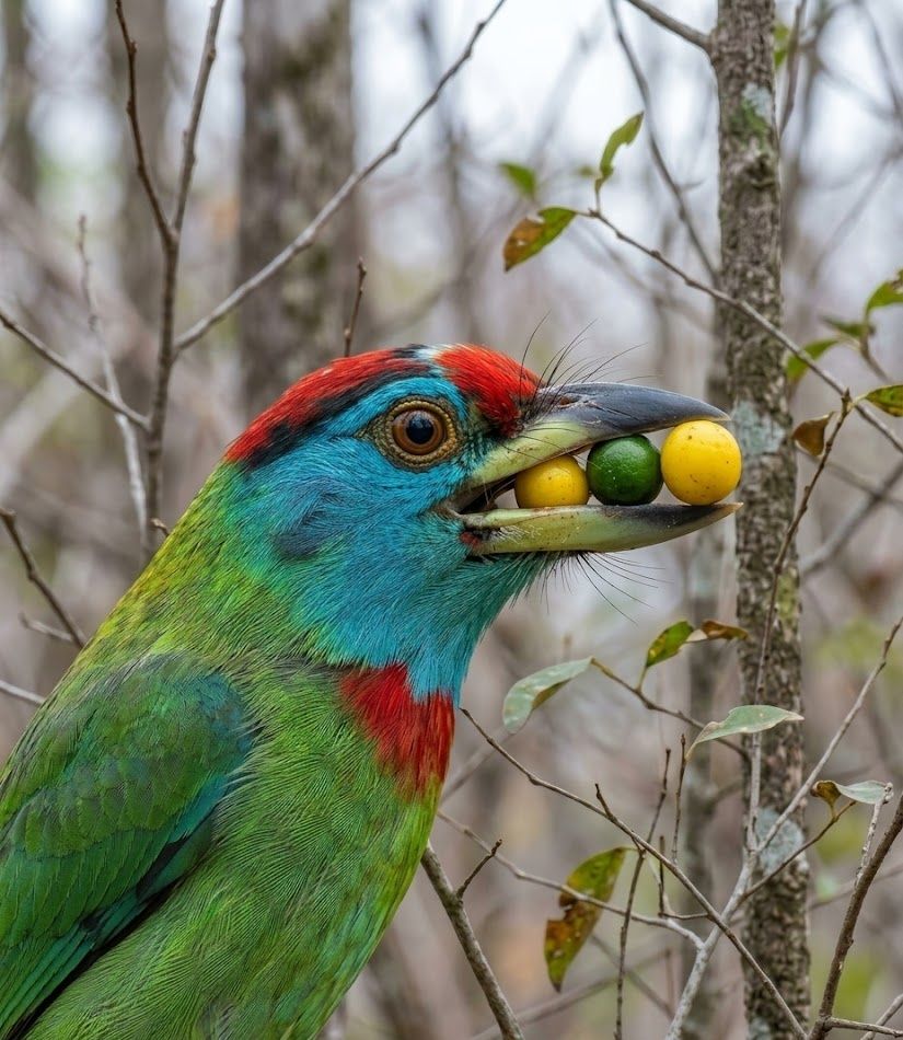 In the lush, rain-soaked woodlands of South and Southeast Asia, the Blue-throated Barbet perches quietly among fruiting trees. Its green body blends into the leaves, but flashes of blue and red around its throat and face give it a jewel-like charm. It feeds on figs, berries, and insects, moving deliberately through the canopy. What makes it extraordinary is its call — a steady, rhythmic tuk… tuk… tuk that can echo for long stretches, marking time in the forest. A hidden clock in the treetops, yet a patient keeper of the canopy.