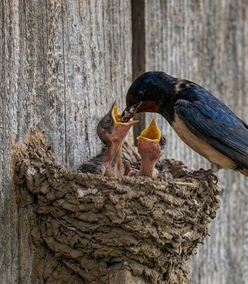 In open countryside, farms, and village rooftops across much of the world, the Barn Swallow returns each year to the same nesting spots. It gathers beakfuls of wet mud, shaping them layer by layer into a neat cup fixed under eaves, bridges, or beams. Inside, the nest is lined with soft grass and feathers, creating a safe cradle for its young. What makes it extraordinary is this craftsmanship — a fragile-looking structure that can last for seasons with care and reuse. A small home shaped by patience, yet a timeless symbol of life close to human homes.