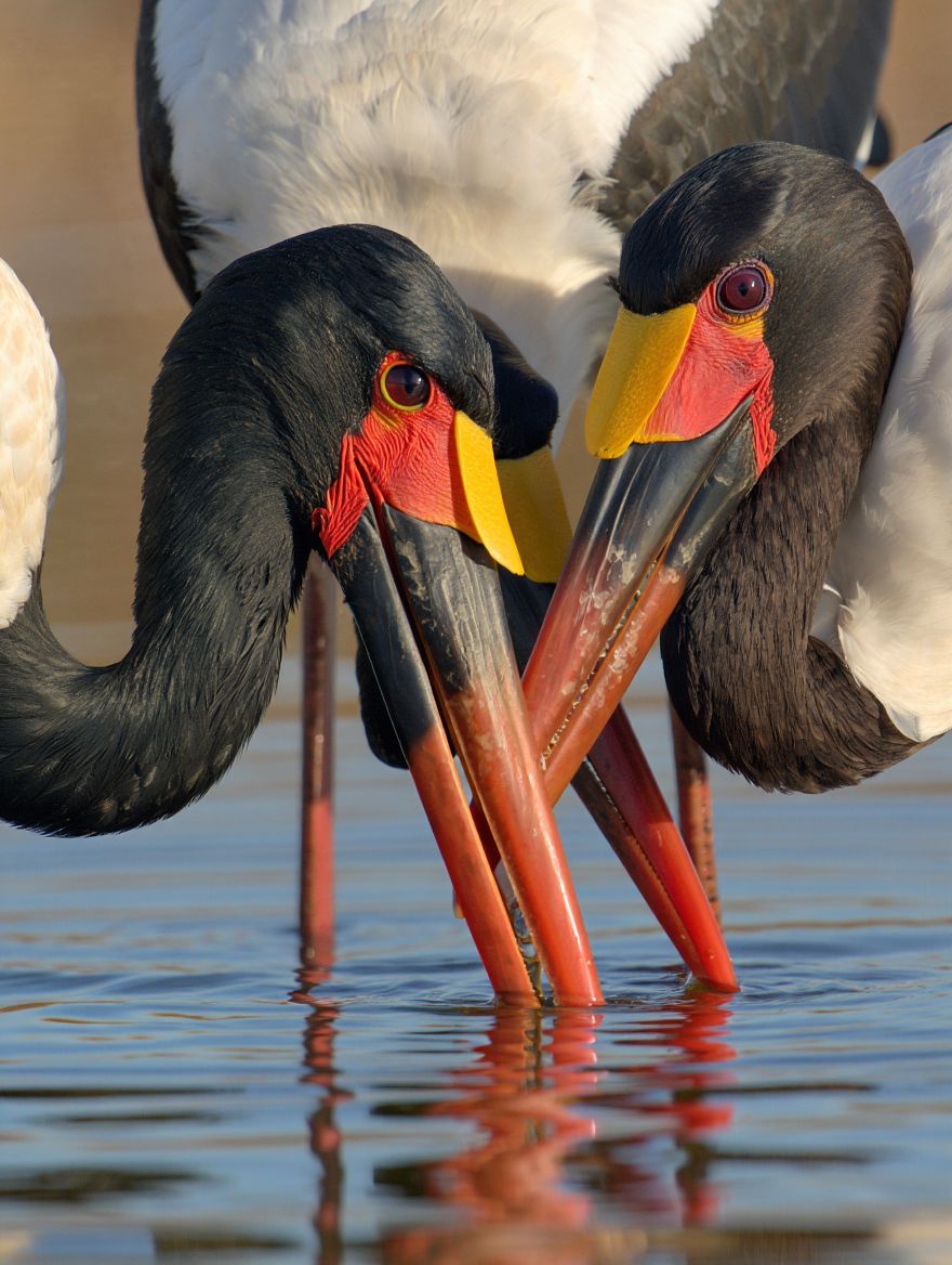 In the wetlands and rivers of sub-Saharan Africa, the Saddle-billed Stork strides through shallow water with commanding presence. Its glossy black-and-white body contrasts with vivid red legs, while the massive bill carries a striking band of yellow — the “saddle” that gives it its name. It hunts fish, frogs, and small creatures with precise, powerful strikes. What makes it extraordinary is this bold design — a bird that seems almost too colorful to be real, yet perfectly built for life in wide, sunlit wetlands. A towering figure in open waters, yet a regal sentinel of the marsh.
