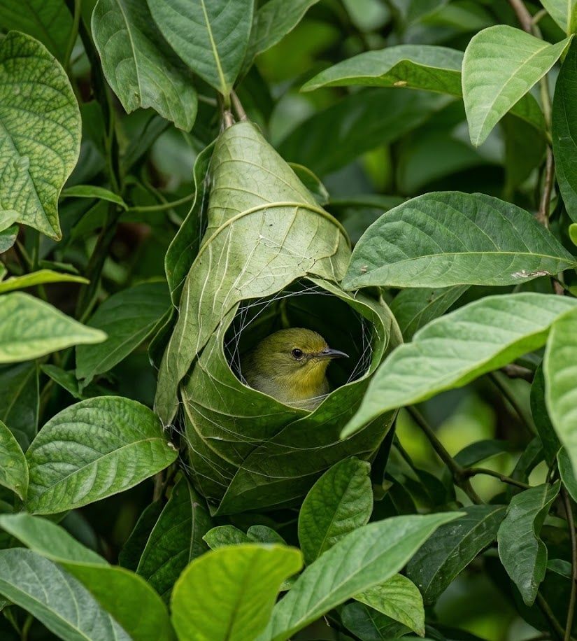 In the gardens and forest edges of South and Southeast Asia, the Common Tailorbird builds one of the most delicate nests in the bird world. Using plant fibers or spider silk as thread, it pierces and sews the edges of large leaves together, forming a hidden cradle tucked safely inside. Within this leafy pouch, it lines the nest with soft materials to protect its eggs. What makes it extraordinary is this true craftsmanship โ a bird that quite literally sews its shelter. A tiny artisan among the leaves, yet a master of living architecture.
