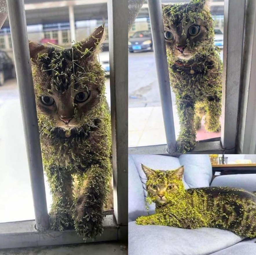 Then, suddenly, he appeared at the window, trying to squeeze in with an expression I couldn’t even begin to describe. His fur was completely covered in tiny seeds, like an accindental work of bitanical art. I couldn’t help but laugh out loud.