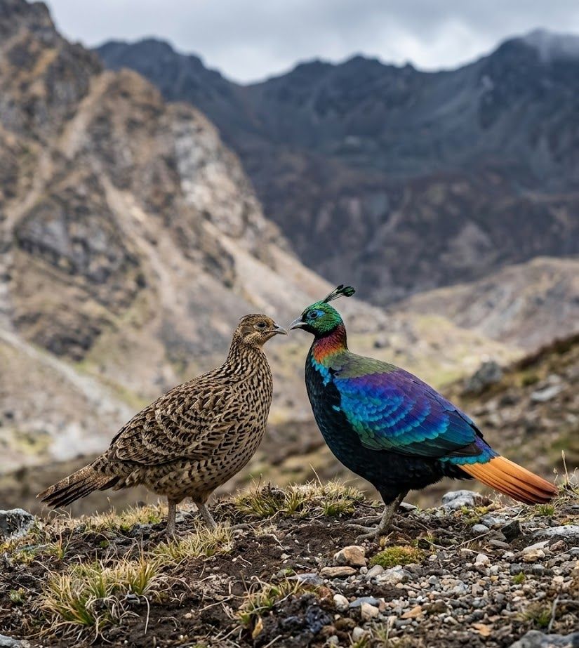 In the high forests and alpine slopes of the Himalayas, the Himalayan Monal flashes with impossible color — feathers shifting between emerald, copper, sapphire, and violet as light touches them. It forages along steep ground for roots, tubers, seeds, and insects, digging through soil with powerful strokes. What makes it extraordinary is this iridescent brilliance — a bird that seems to change color with every movement in the thin mountain air. A jewel of the highlands, yet a resilient spirit of the alpine wild.