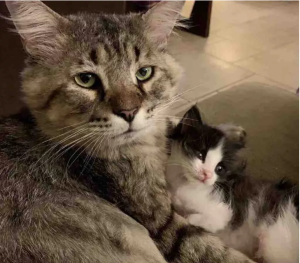 Emily was worried that the kitten wouldn’t make it, but thanks to Runt, he did. Runt is now the new dad every time Emily brings home a foster kitten.