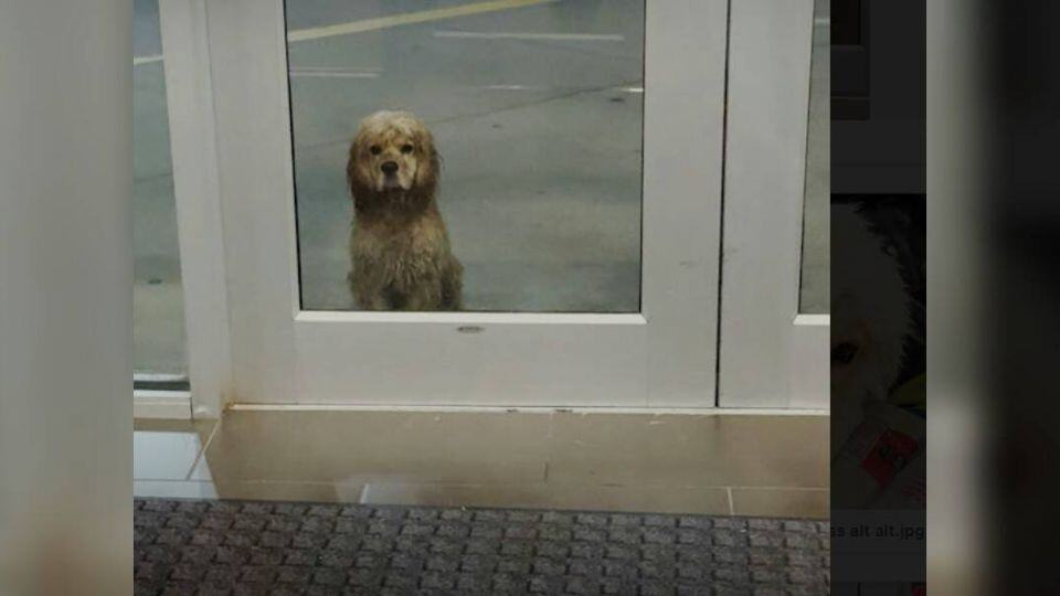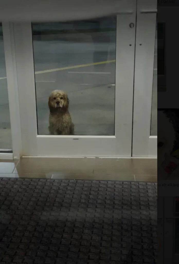 Sitting quietly by the door, drenched from head to toe, was a small brown dog. He didn’t move or bark — he simply stared through the glass as if hoping someone would finally see him.
