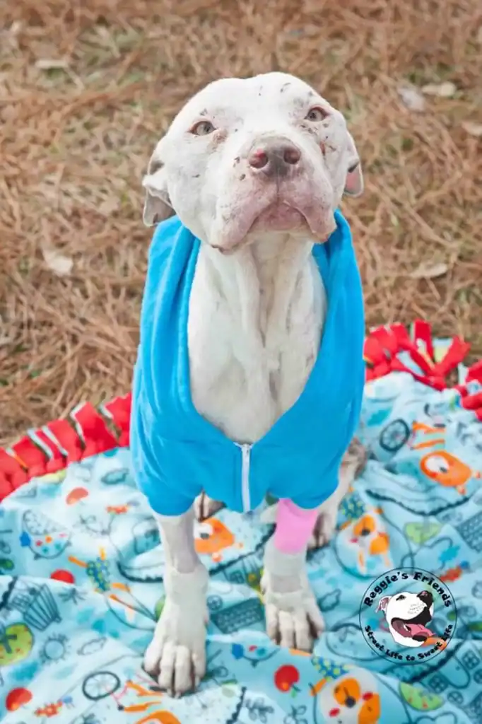 The injuries oozed with infection, and his fur was matted with dried blood. His ribs jutted sharply through his skin.