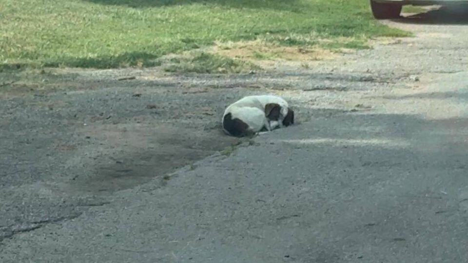 When their vehicle rolled into the nearly empty industrial strip, they immediately saw what the neighbors had been describing. The father dog was curled into such a tight ball in the center of the street that he almost looked like a discarded object instead of a living, breathing soul waiting for help.