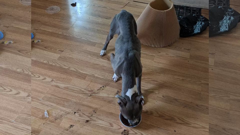 Johnson knelt down and poured kibble into the bowl. The dog devoured the food as if it were the first real meal she’d had in days.
