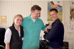 Nine months after his adoption, the couple who saved him had the pleasure of visiting him in his new home. Cocoa was thrilled to see his old friends.