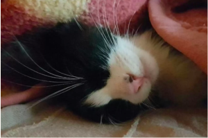 When Klauka realized the little black and white kitten was too exhausted to even lift her head, he knew he couldn’t abandon her. Though some people mocked him for touching a dirty flea-ridden street cat, Klauka carried her around for the rest of the evening, smuggling her into his hotel room for at least one night’s respite from the elements.