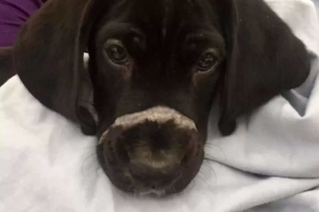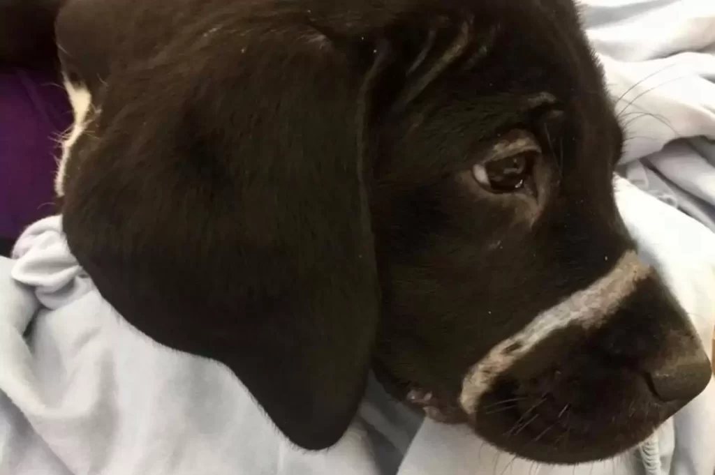 Dr. Bryant Phillips examined the dog and quickly realized how close he had come to death. The pup was weak, malnourished, and badly dehydrated. His stomach carried signs of parasites, and his jaw was tender and swollen.