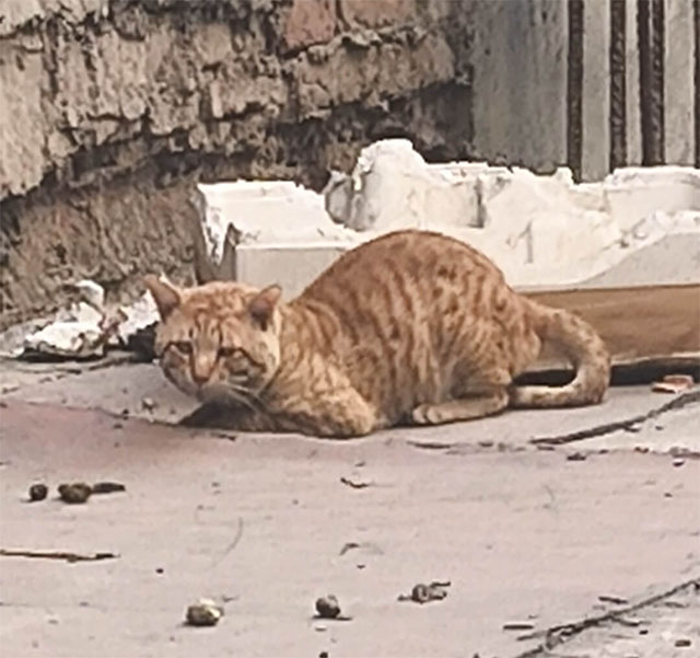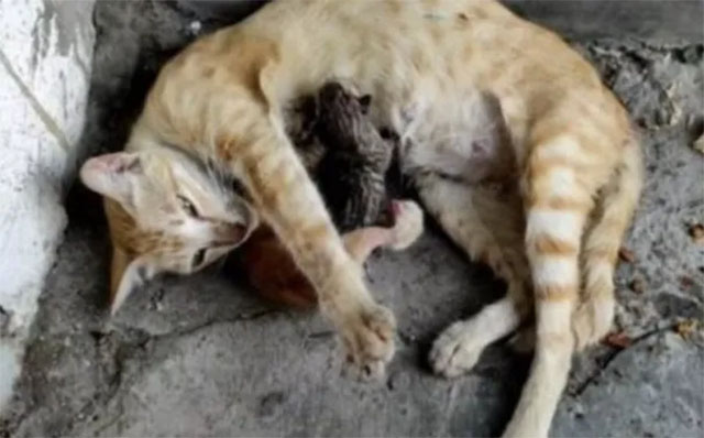 Her breaths came shallow and uneven, each one a small effort. Her ribs moved faintly under thin fur dusted with dirt and city grime. She wanted to cry, but no sound came. The world inside her felt smaller than the world around her — narrowed down to a single instinct: hold on.