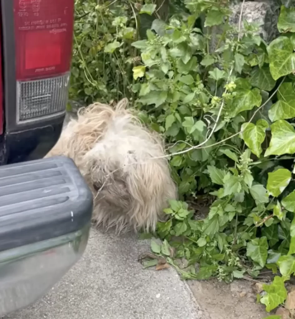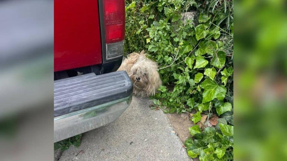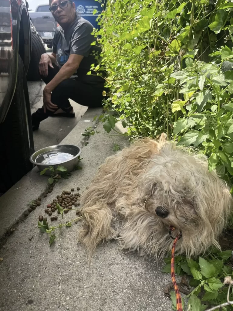 His fur was messy and filled with sticks from hiding in bushes, his paws dusty from pacing the street. Someone had left behind a bit of food and water, but no one stayed to help him.