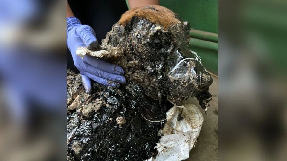 The pup was frozen in thick black tar that swallowed his tiny frame.