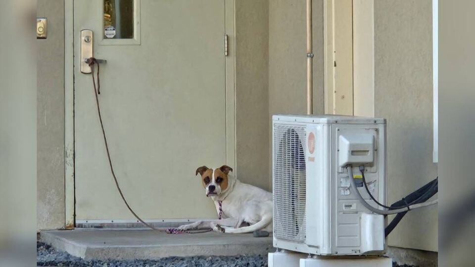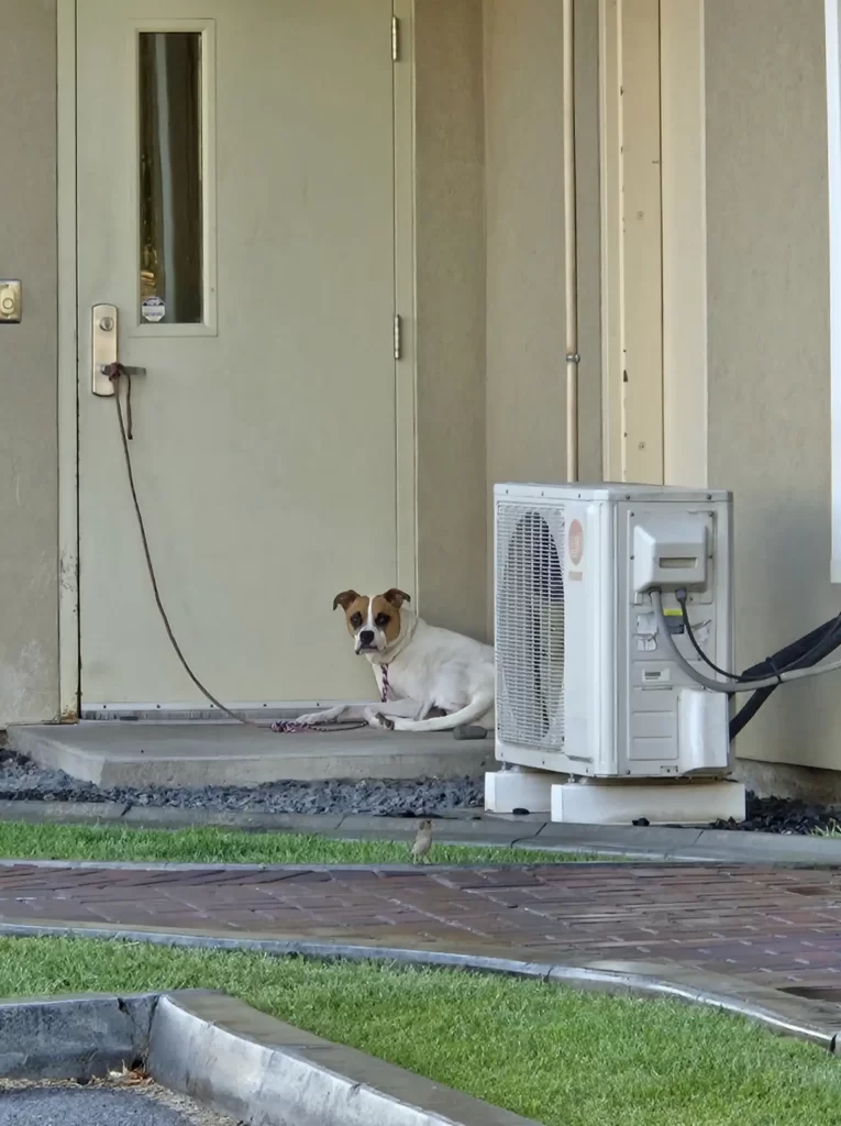 Curled up by the back door, next to the humming air conditioner, was a lonely dog tied to a short piece of rope.