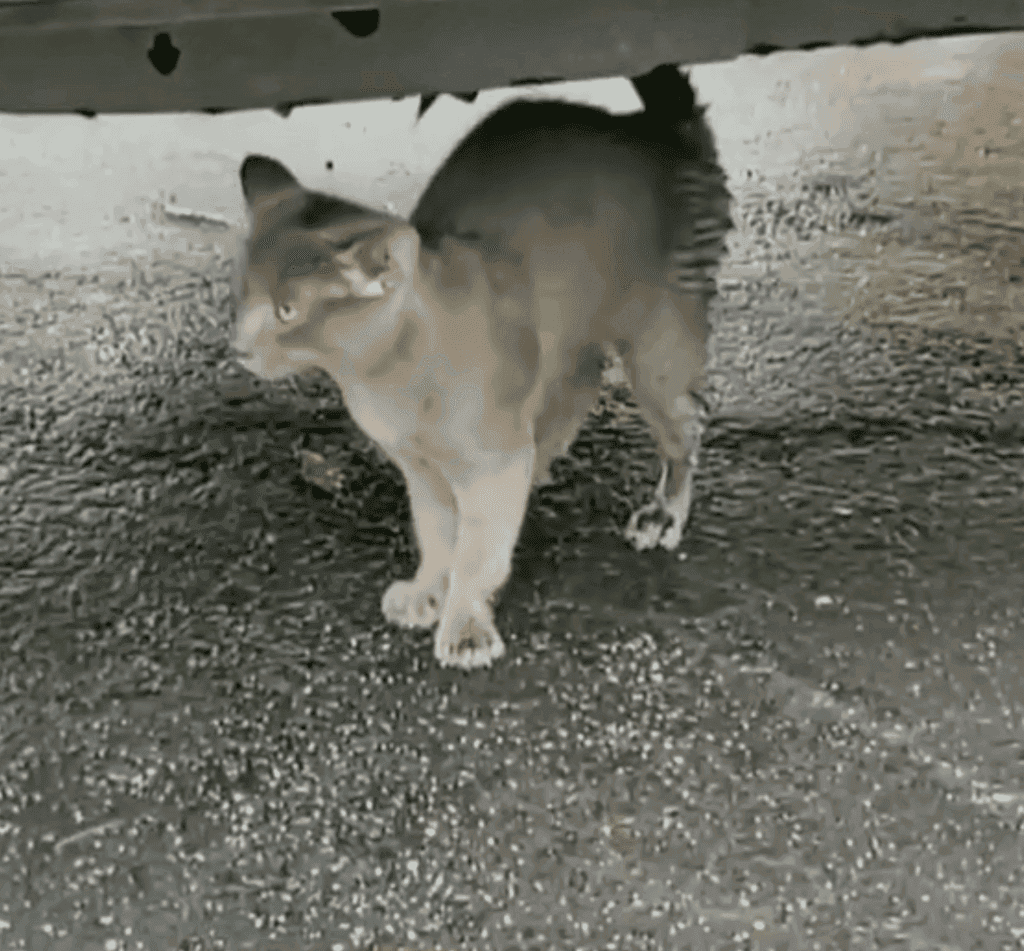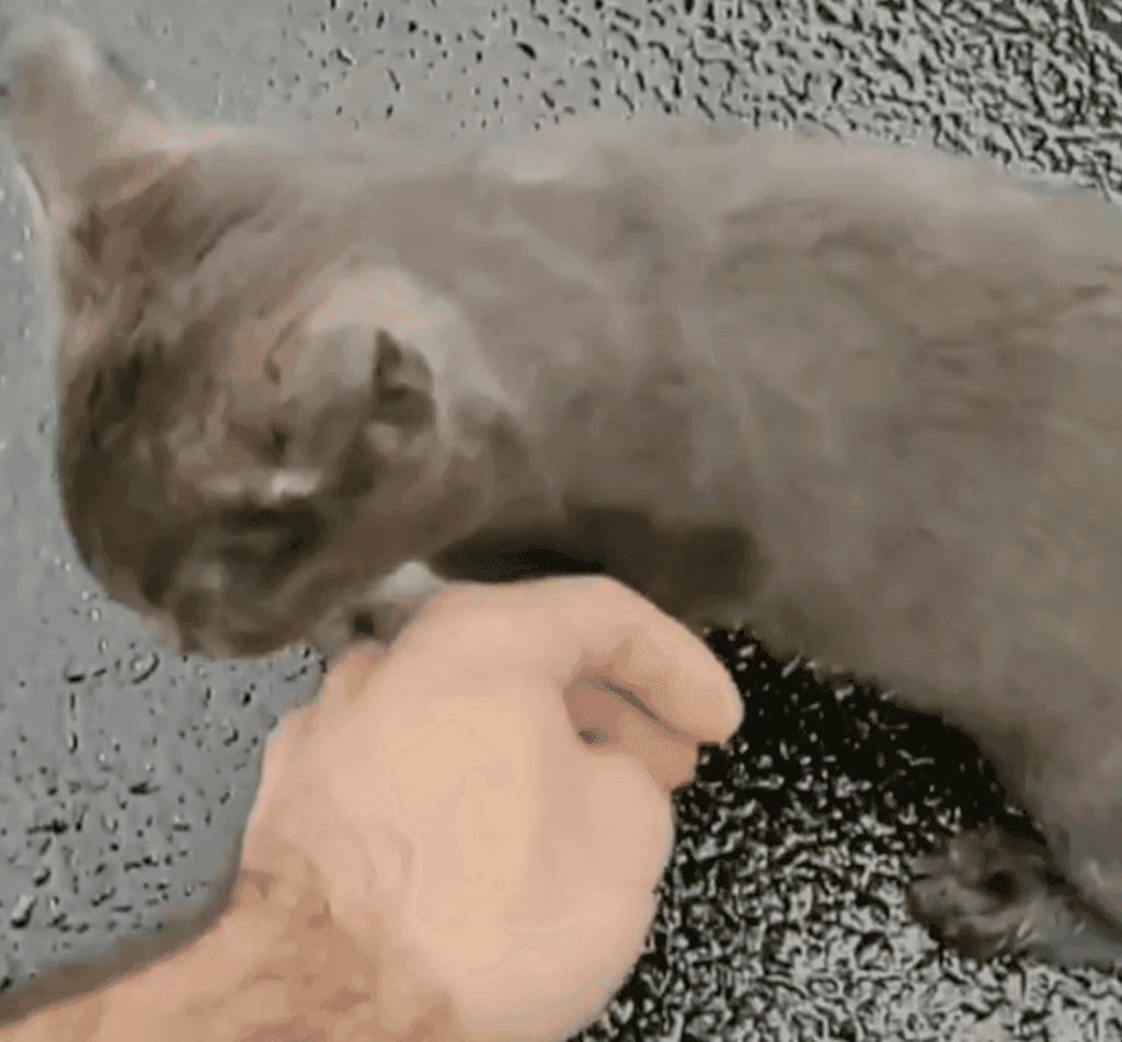 A tiny cry caught his attention. Faint but persistent, the sound led him to a little gray kitten, alone and clearly in bad shape.