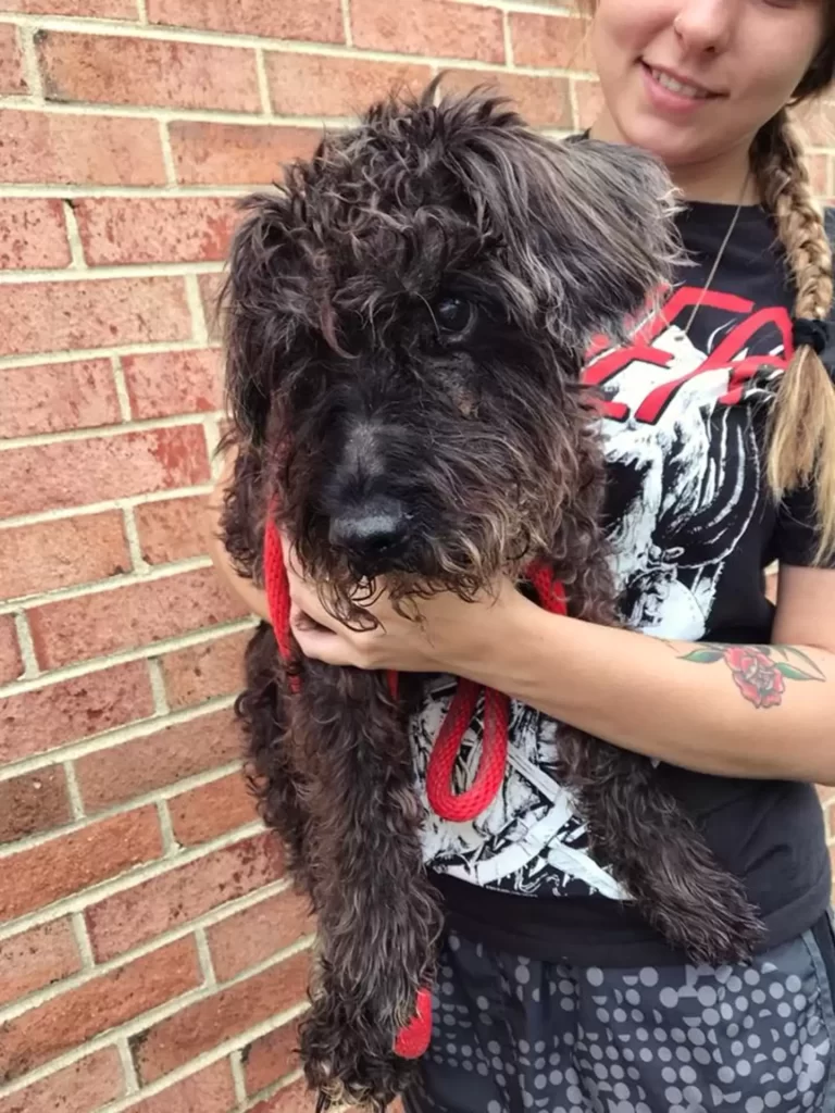 His coat was dirty and tangled, his body stiff from exhaustion, and his spirit looked broken. The schnauzer–poodle mix had once spent more than a decade in the comfort of a home, yet now he was tied to a pole and left behind.