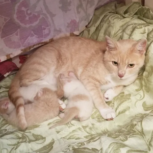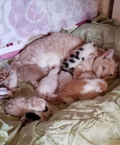She finally began to eat from a dish, building her strength while simultaneously feeding the young peanuts, after violent shows of love for her beloved children.