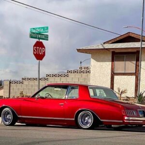 This picture just feels like a West Coast Sunday cruise. That deep red paint shining in the sun, sitting low on wire wheels with whitewalls… clean and…