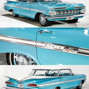 59 Impala is pure late 50s style. The bright turquoise paint, huge chrome grille, and those legendary bat wing fins in the back make it one of…