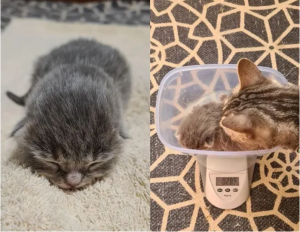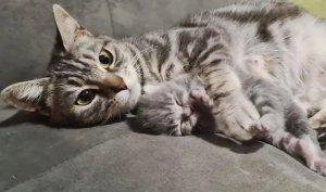 “It’s very surprising, but she gave birth to only one kitten, which is rare,” says Nikki.