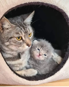 Ignoring all the cozy beds, large boxes available to her and comfortable upholstered furniture, she chose a hard cramped compartment in the cat’s climbing frame where you can keep the precious baby Tato so close that there is nowhere closer.