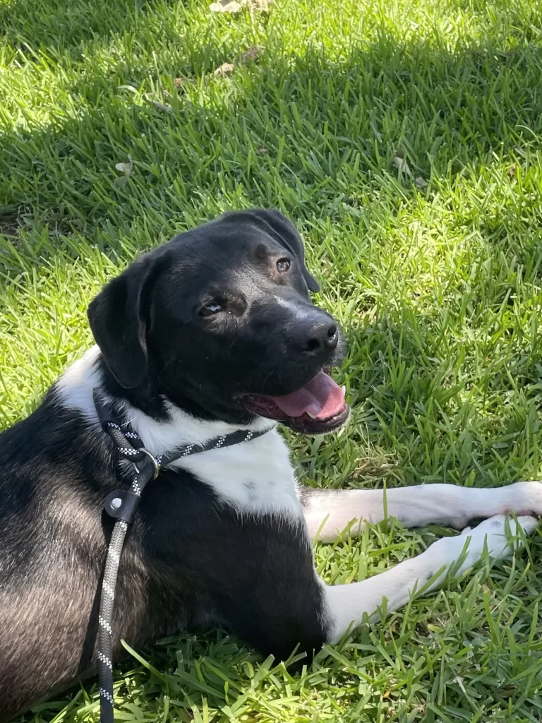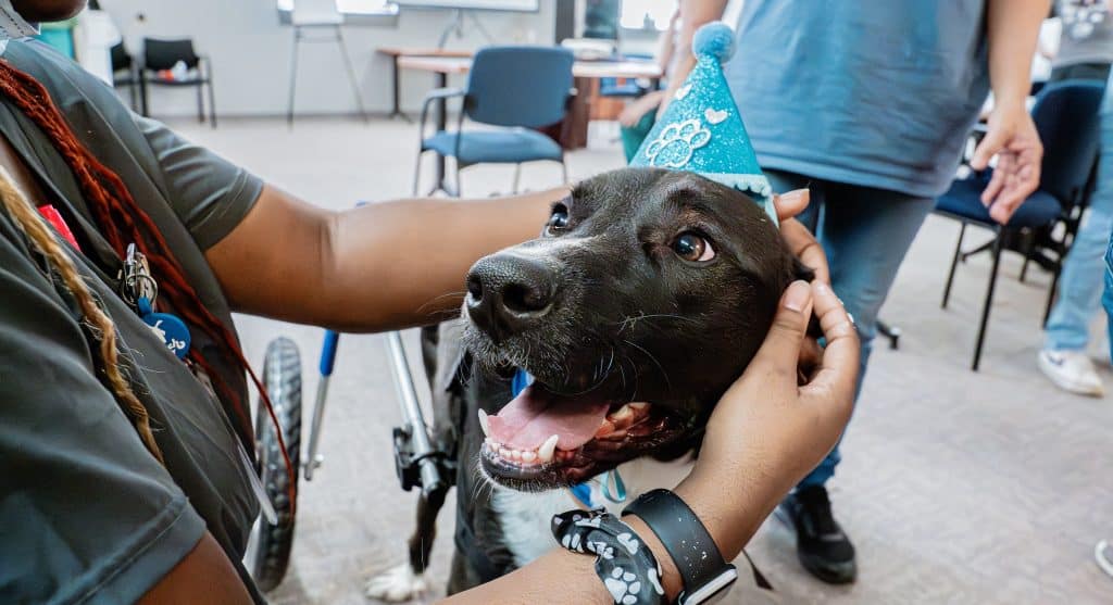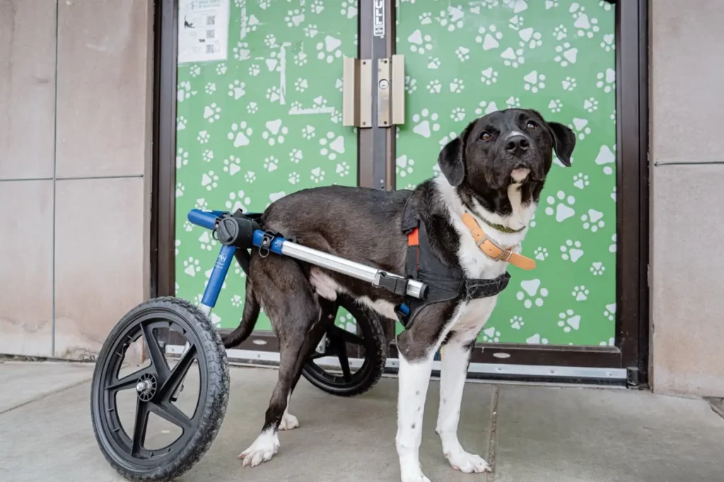 Instead, he charges forward, eyes bright, tongue out, thrilled at the possibility of every new adventure. His favorite volunteer often helps him practice with his wheels, guiding him through turns and letting him show off his new skills.