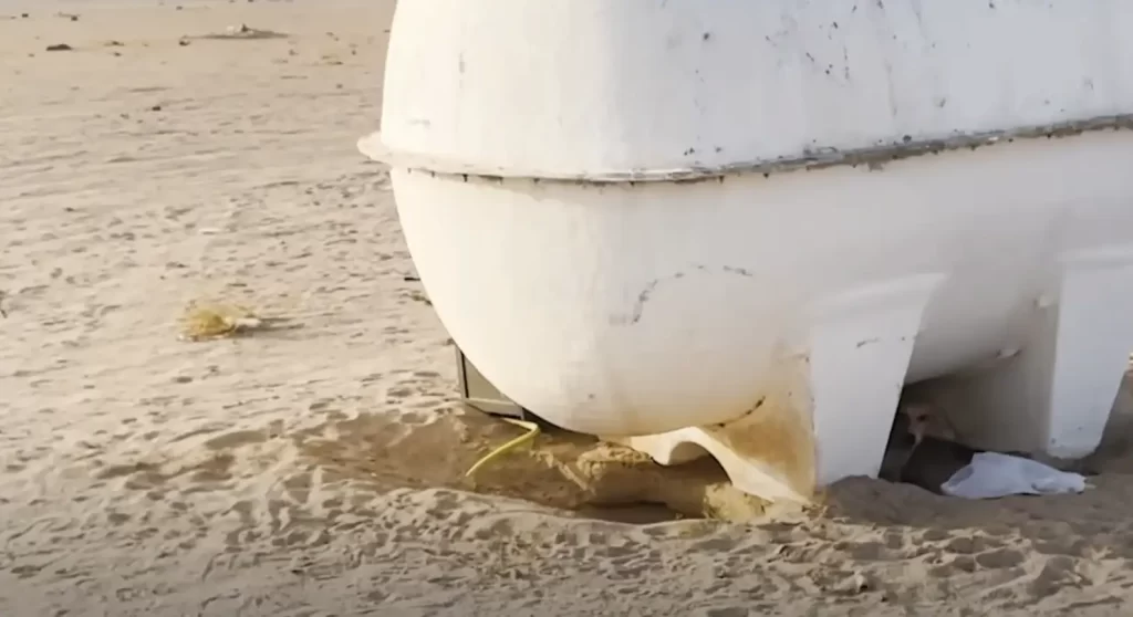 After searching across the scorching sands, the rescuers finally spotted her. She was hidden beneath a large water tank, lying low in the dirt.