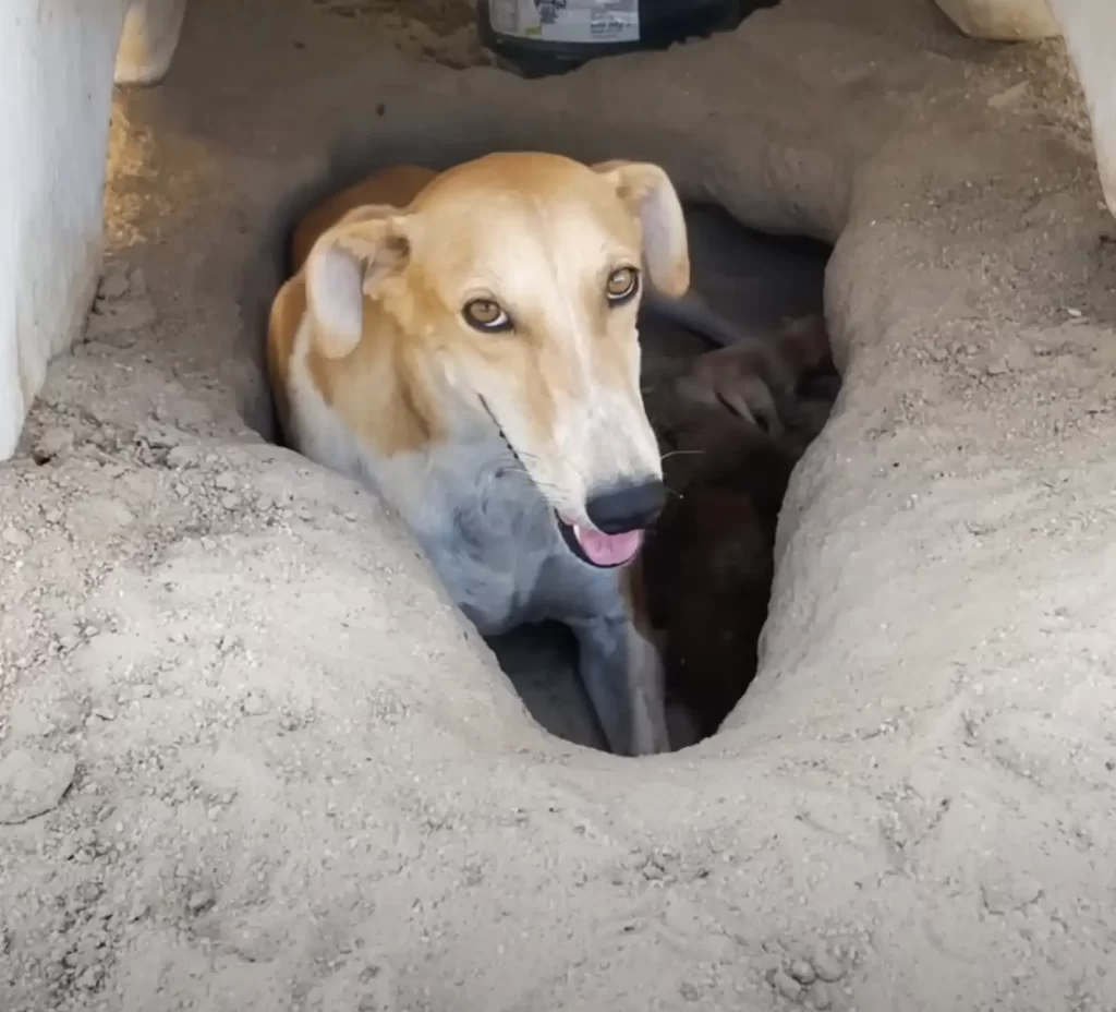 But she wasn’t alone. The dog had dug a hole under the tank and was curled around three tiny puppies. Her body served as their shelter, her will their only shield.