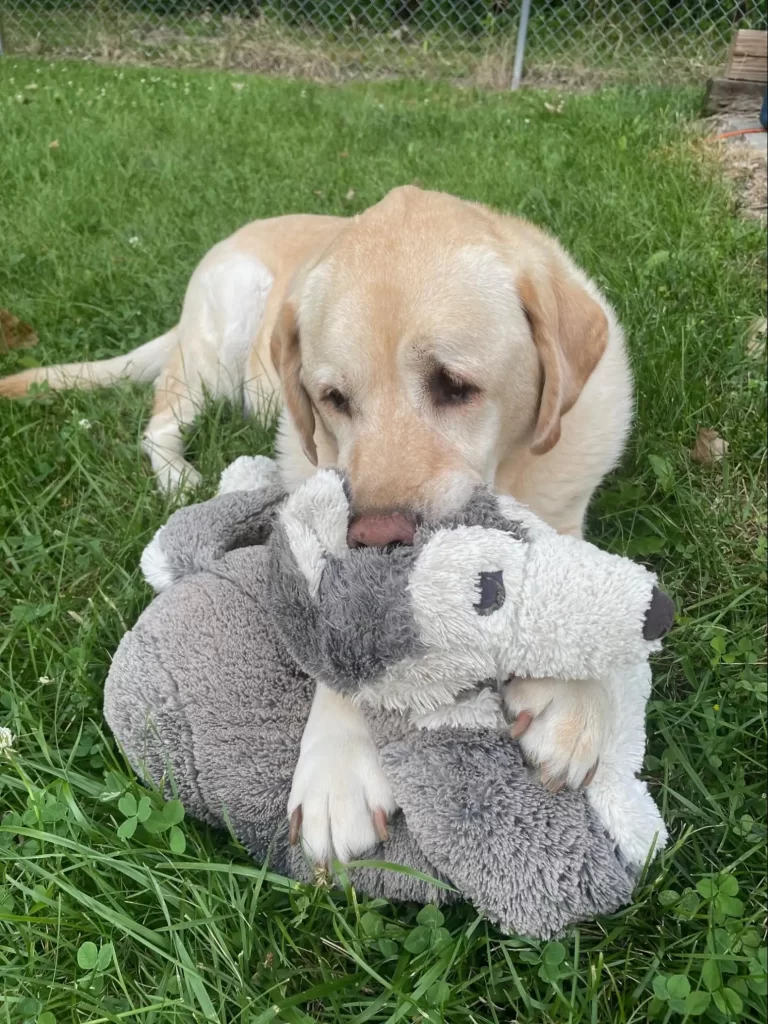 Buttercup doesn’t play alone. She shares her home with another yellow Lab named Peanut, a playful 6-year-old who prefers fetch, chew toys, and long naps in the sun.