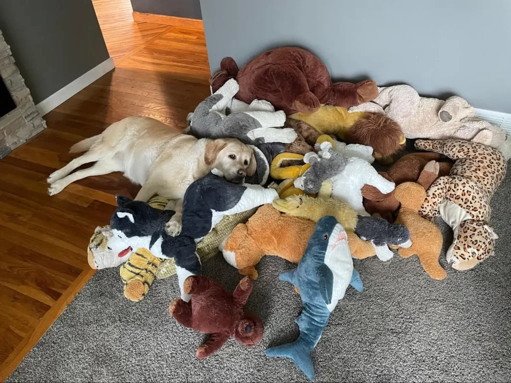 Ever since Jackie’s husband, Don, installed a small doggy door, the 8-year-old Lab has made it her mission to move her soft toys outside one by one.