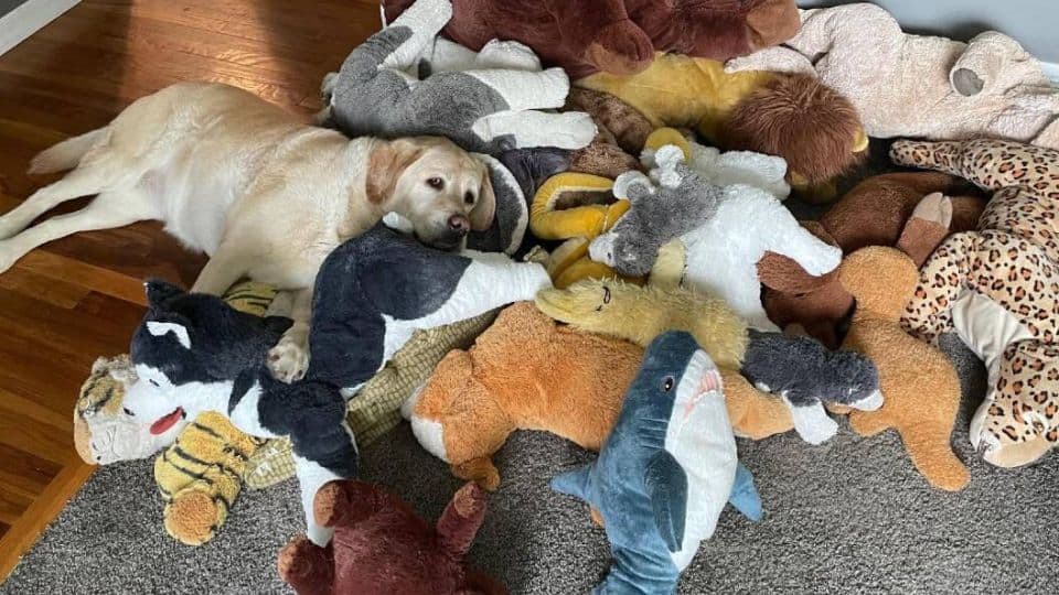 While she’s dedicated to bringing the toys outside, she absolutely refuses to return them indoors. Each evening, Jackie makes her nightly rounds, gathering the soggy, muddy, and occasionally frozen plushies from the yard.