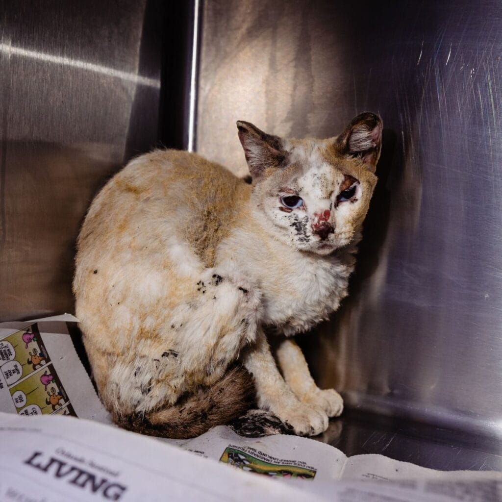 They explained that her home had been completely destroyed, yet this little cat had fought her way out.