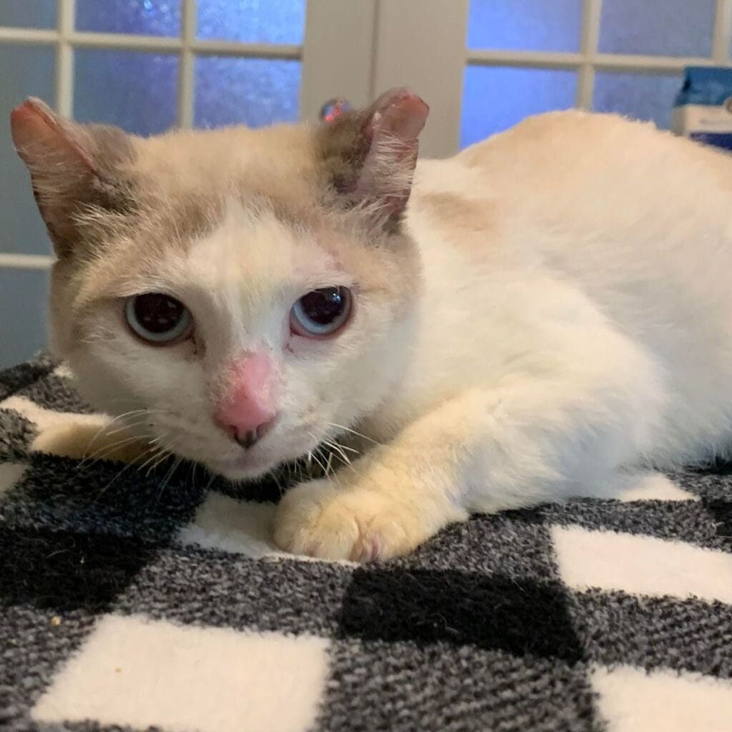 Vets had to remove dead tissue from her ears and all of her hind toes, which had been badly damaged in the fire.