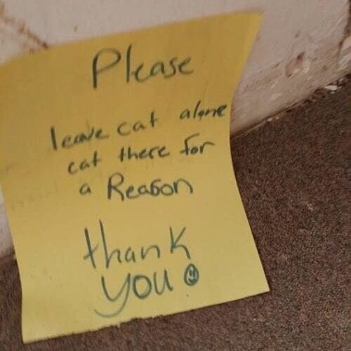 Lying in the street, the poor feline was barely hanging on, and next to it was a note that read, “Please don’t touch the cat, he is here for a reason.”