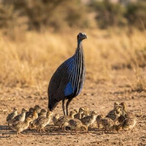 In the sunlit savannas of East Africa, this striking, long-necked sentinel strides across open ground in tight, purposeful bands. It forages for seeds, bulbs, insects, and fallen…